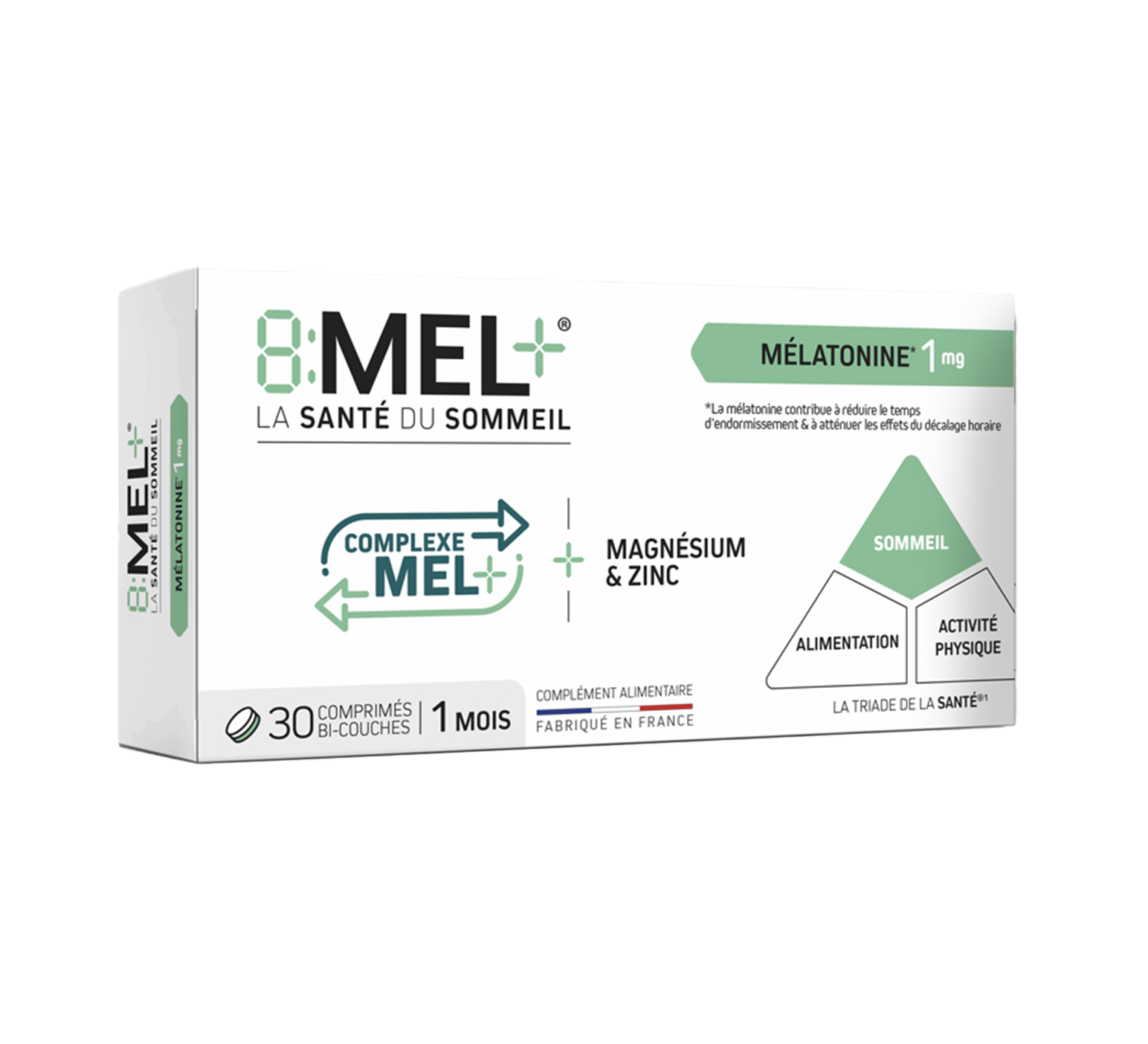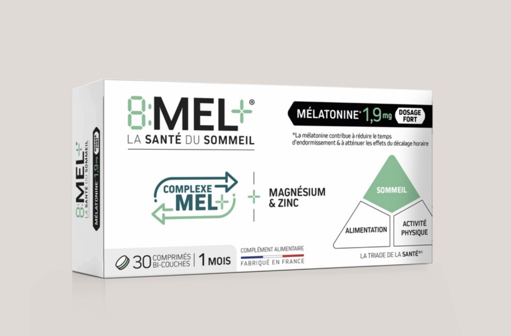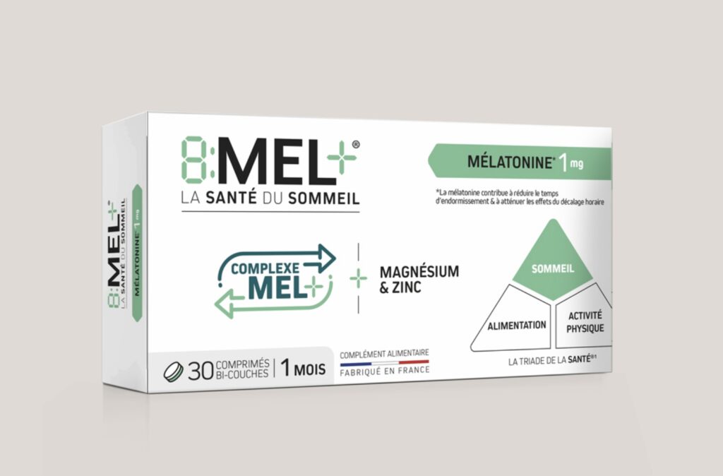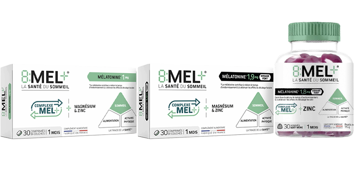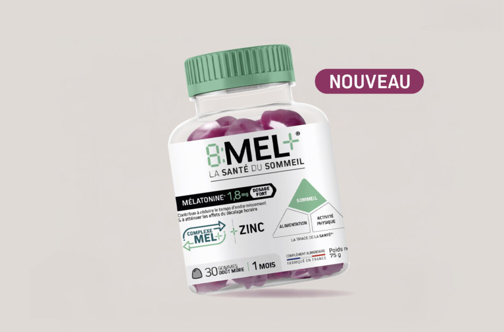 La triade de la santé met en évidence que le sommeil est désormais aussi important que l’alimentation et l’activité physique. C’est à partir des données scientifiques de la triade de santé, que nous avons développé la gamme 8MEL+. C’est une formule unique pour le sommeil associant la mélatonine* au complexe MEL+ (composé de précurseur de la synthèse de la mélatonine) pour aider à s’endormir plus rapidement, sans risque de dépendance. De plus, le magnésium contribue à réduire la fatigue.