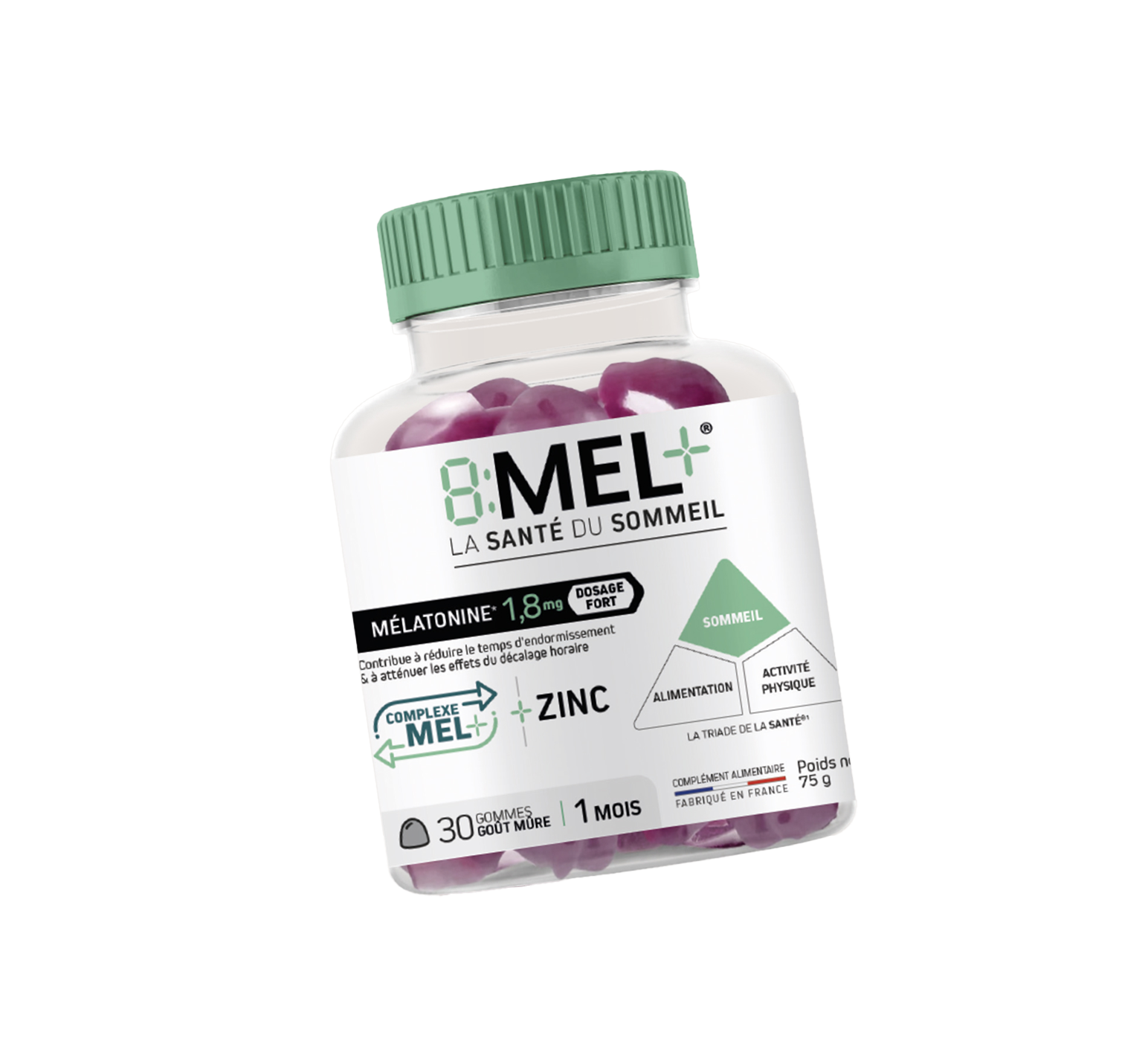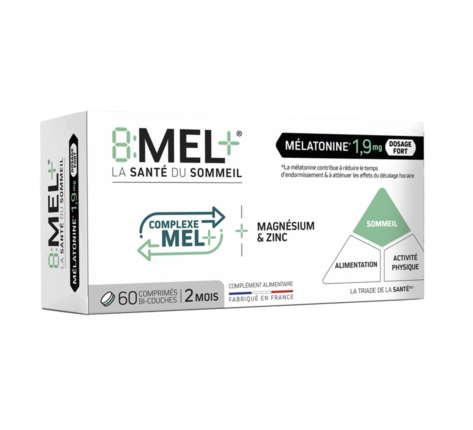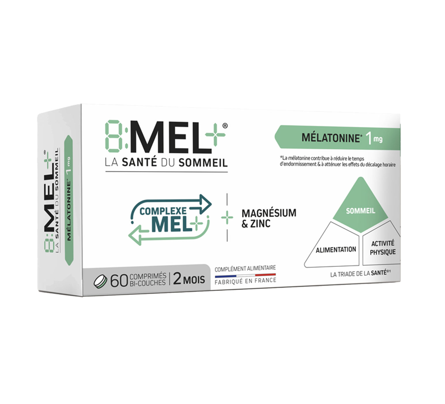La triade de la santé met en évidence que le sommeil est désormais aussi important que l’alimentation et l’activité physique. C’est à partir des données scientifiques de la triade de santé, que nous avons développé la gamme 8MEL+. C’est une formule unique pour le sommeil associant la mélatonine* au complexe MEL+ (composé de précurseur de la synthèse de la mélatonine) pour aider à s’endormir plus rapidement, sans risque de dépendance. De plus, le magnésium contribue à réduire la fatigue.
