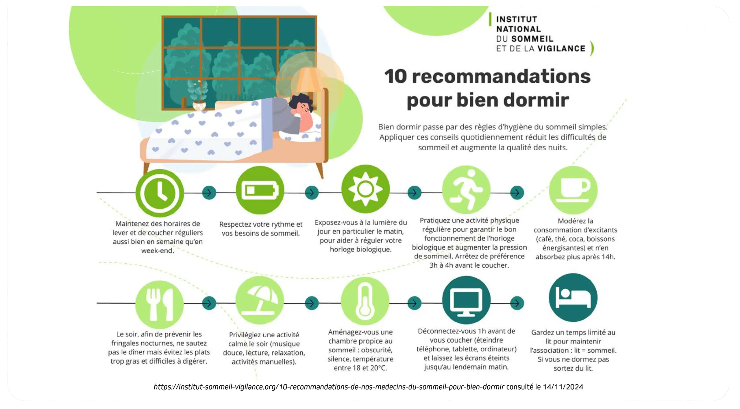 4. L’Assurance Maladie. Insomnies : que faire au quotidien pour mieux dormir ? IN : https://www.ameli.fr/alpes-maritimes/assure/sante/themes/insomnie-adulte/vivre-insomnie (consulté le 26/03/2025)